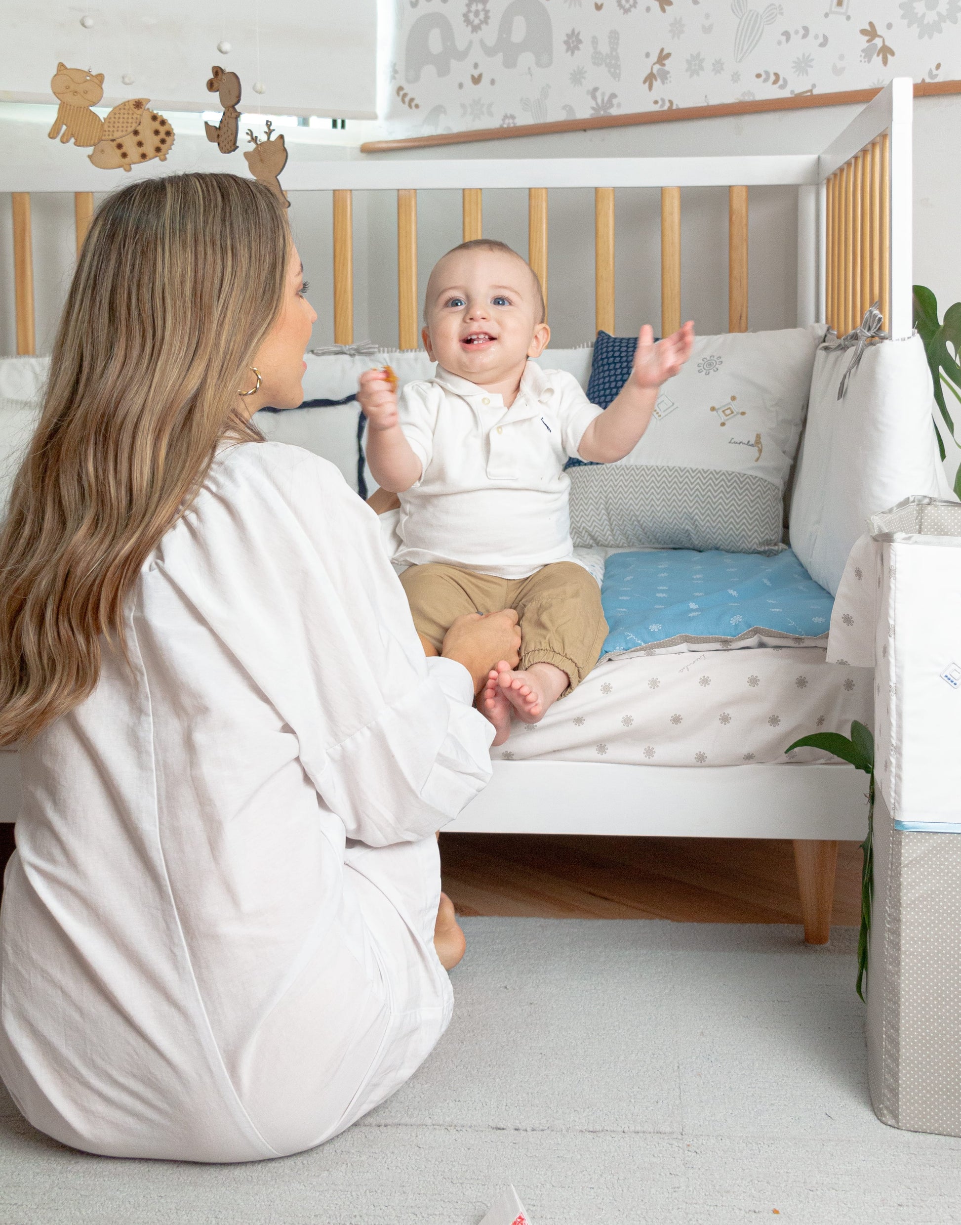 Set de 2 cojines bordados con símbolos icónicos de Lumba en colores grises y beige (neutros). Combinados con diferentes telas haciendo juego con el coordinado. Ideales para decorar cualquier espacio del cuarto.