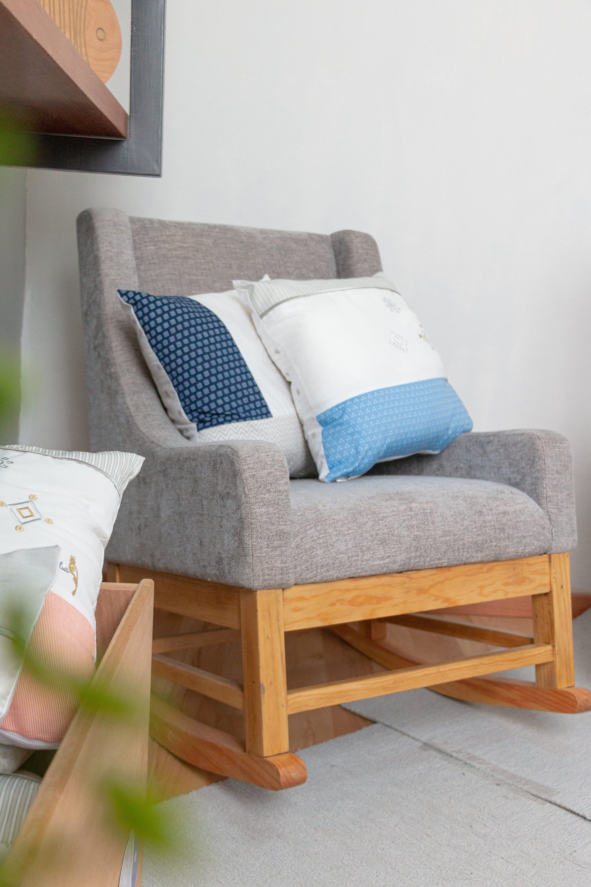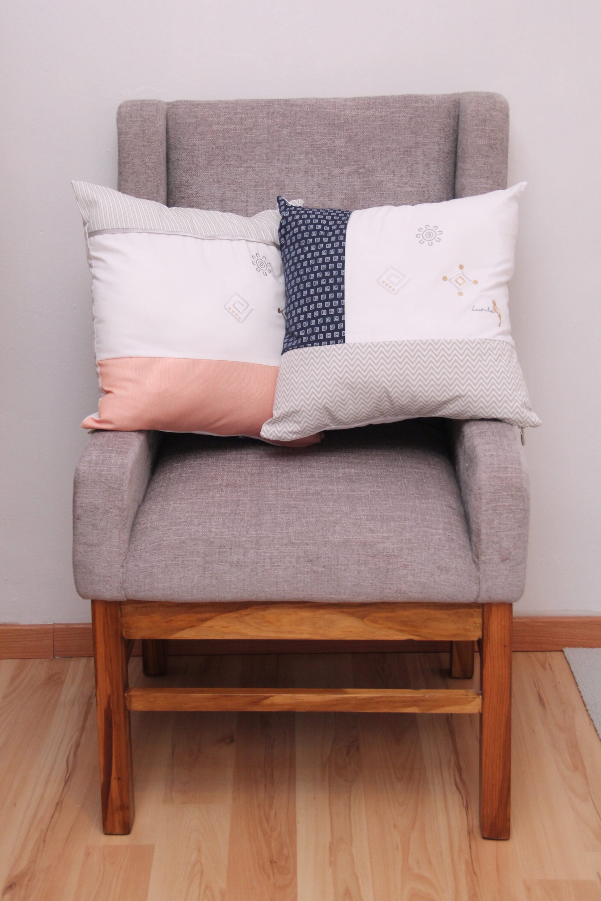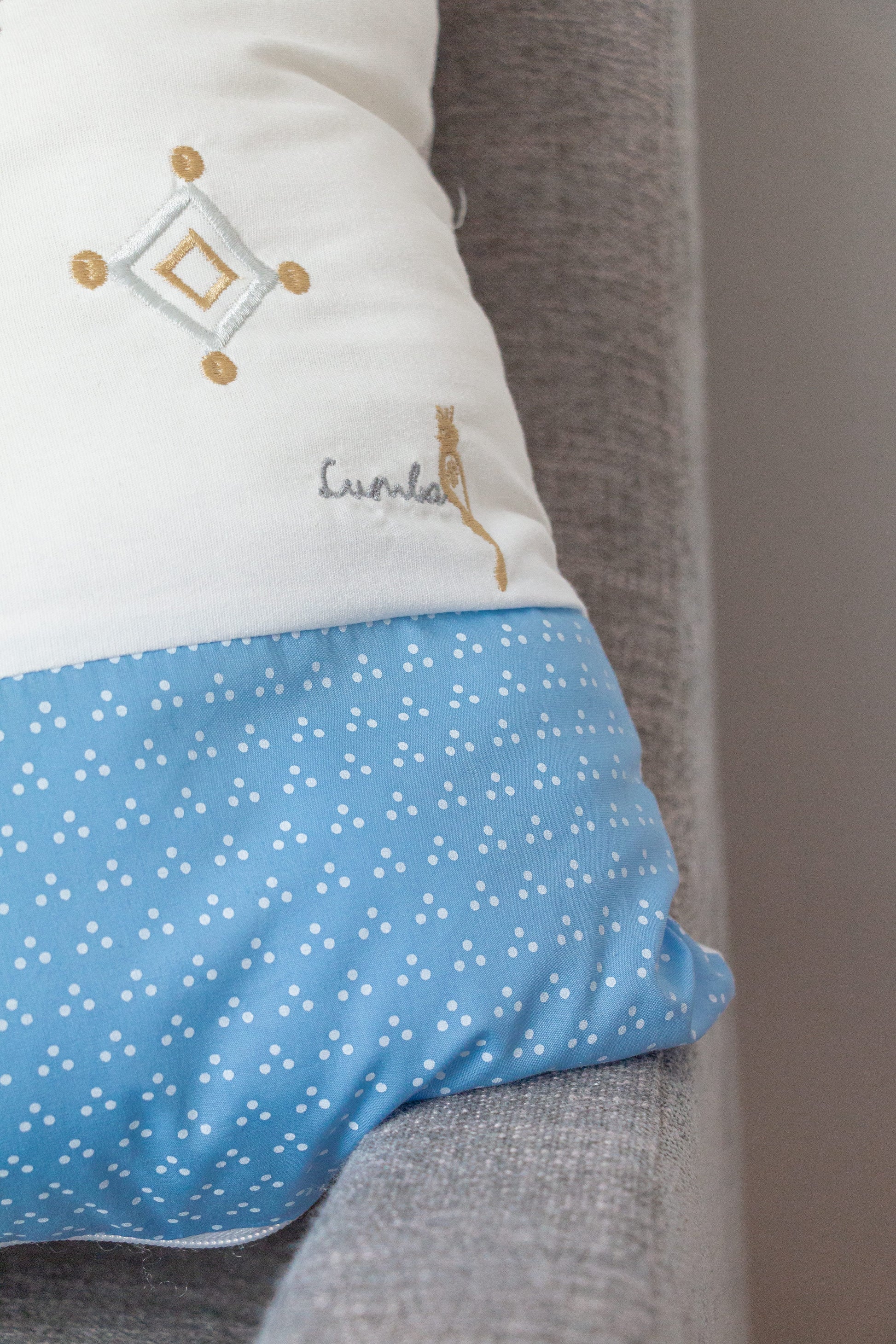 Set de 2 cojines bordados con símbolos icónicos de Lumba en colores grises y beige (neutros). Combinados con diferentes telas haciendo juego con el coordinado. Ideales para decorar cualquier espacio del cuarto.