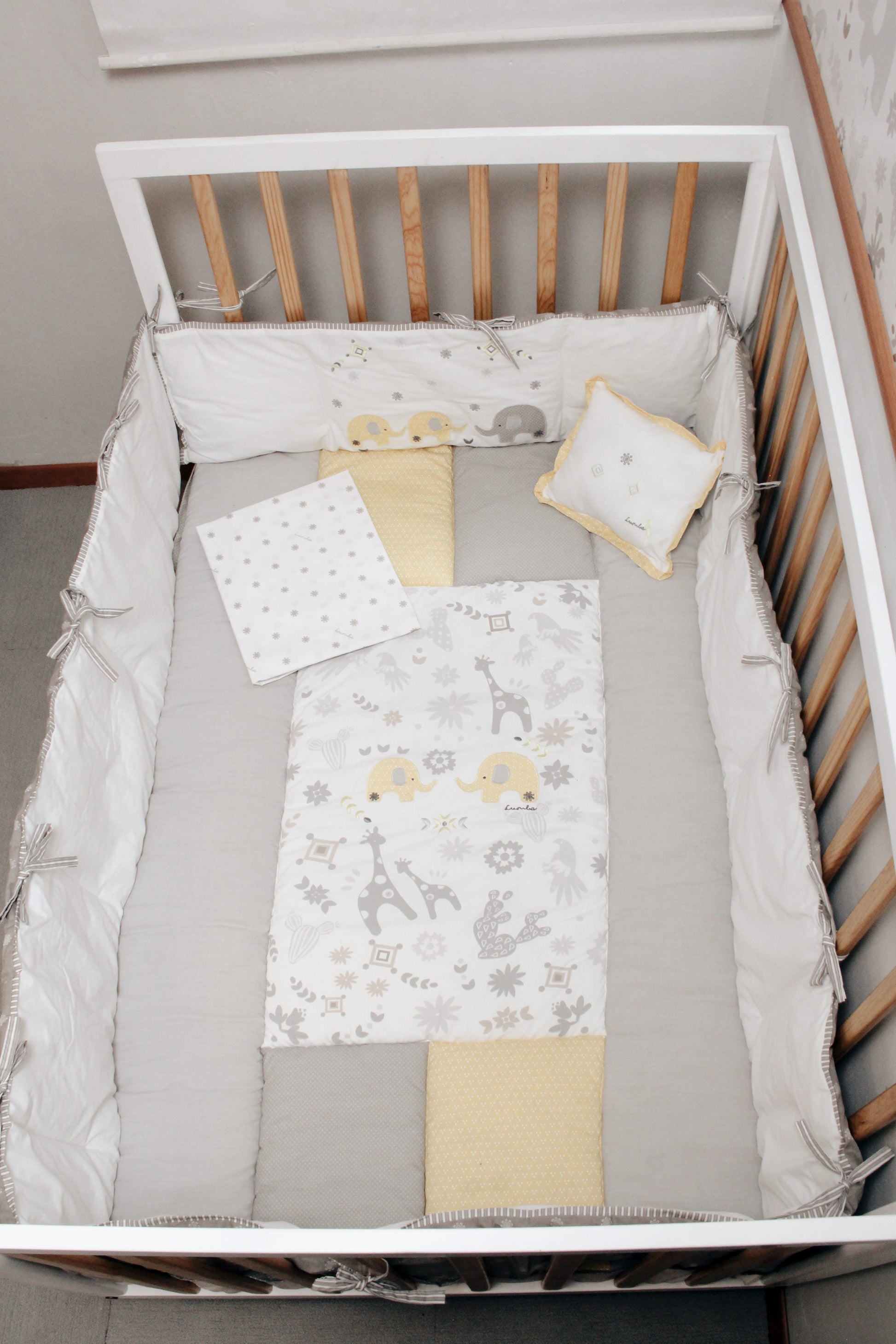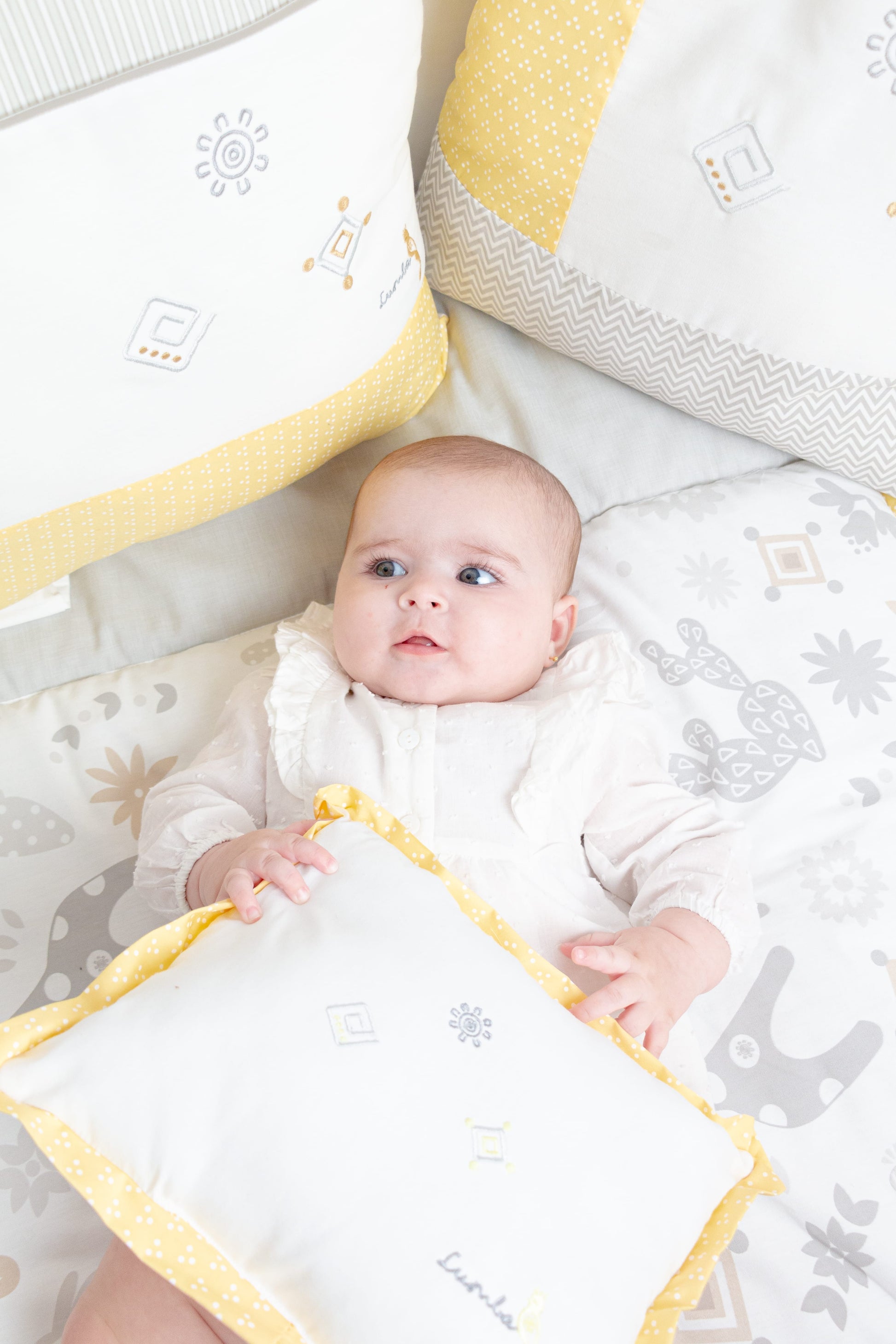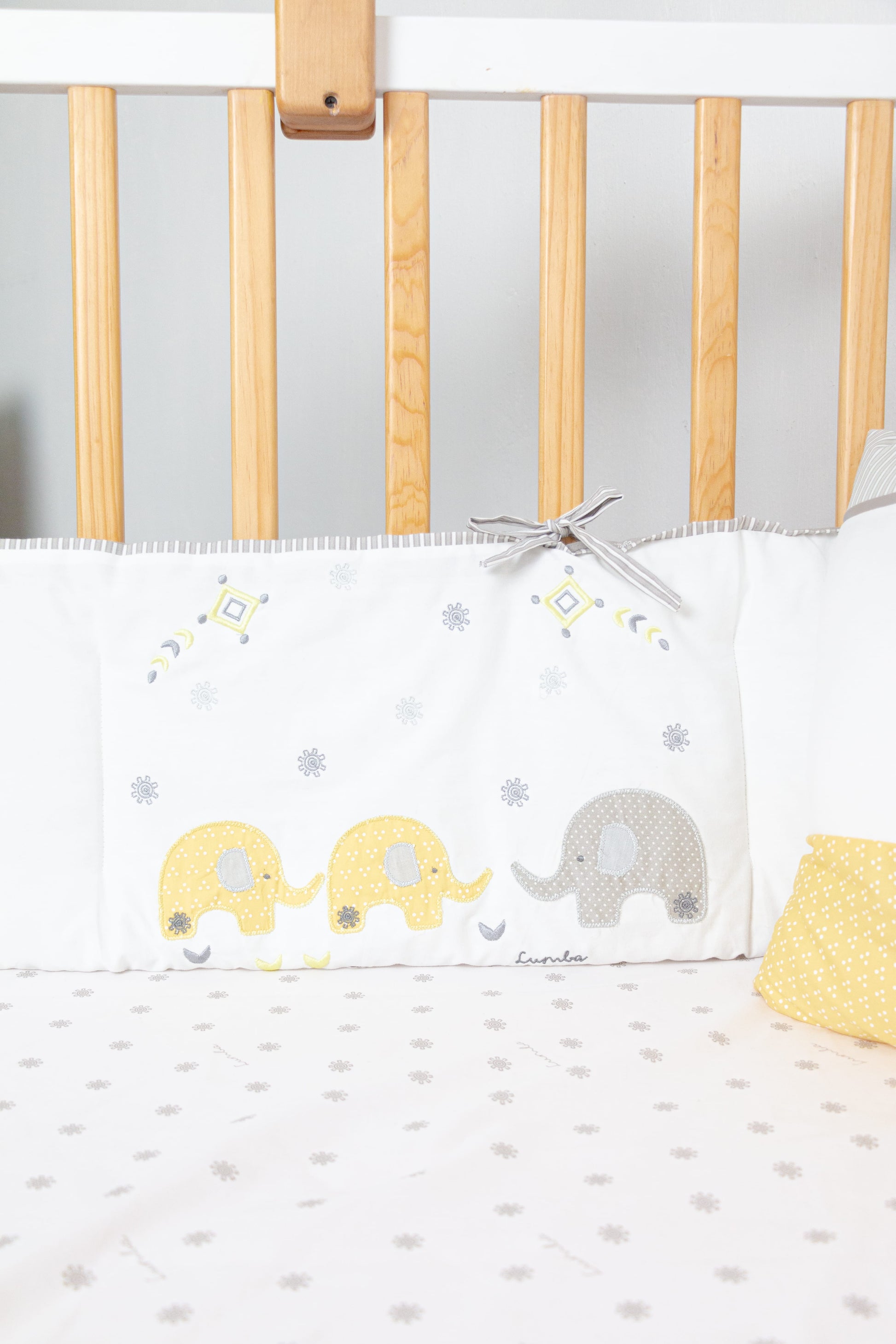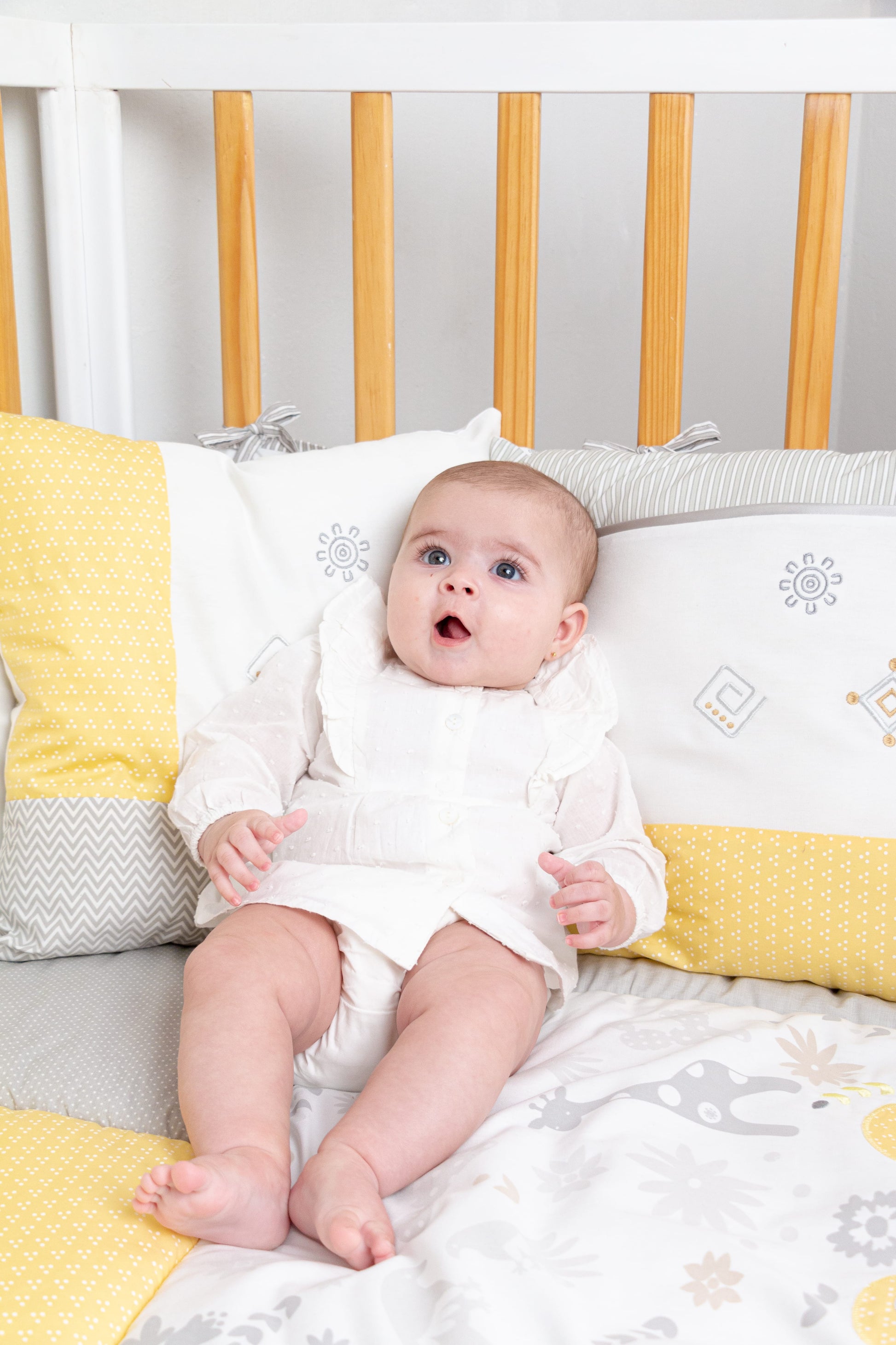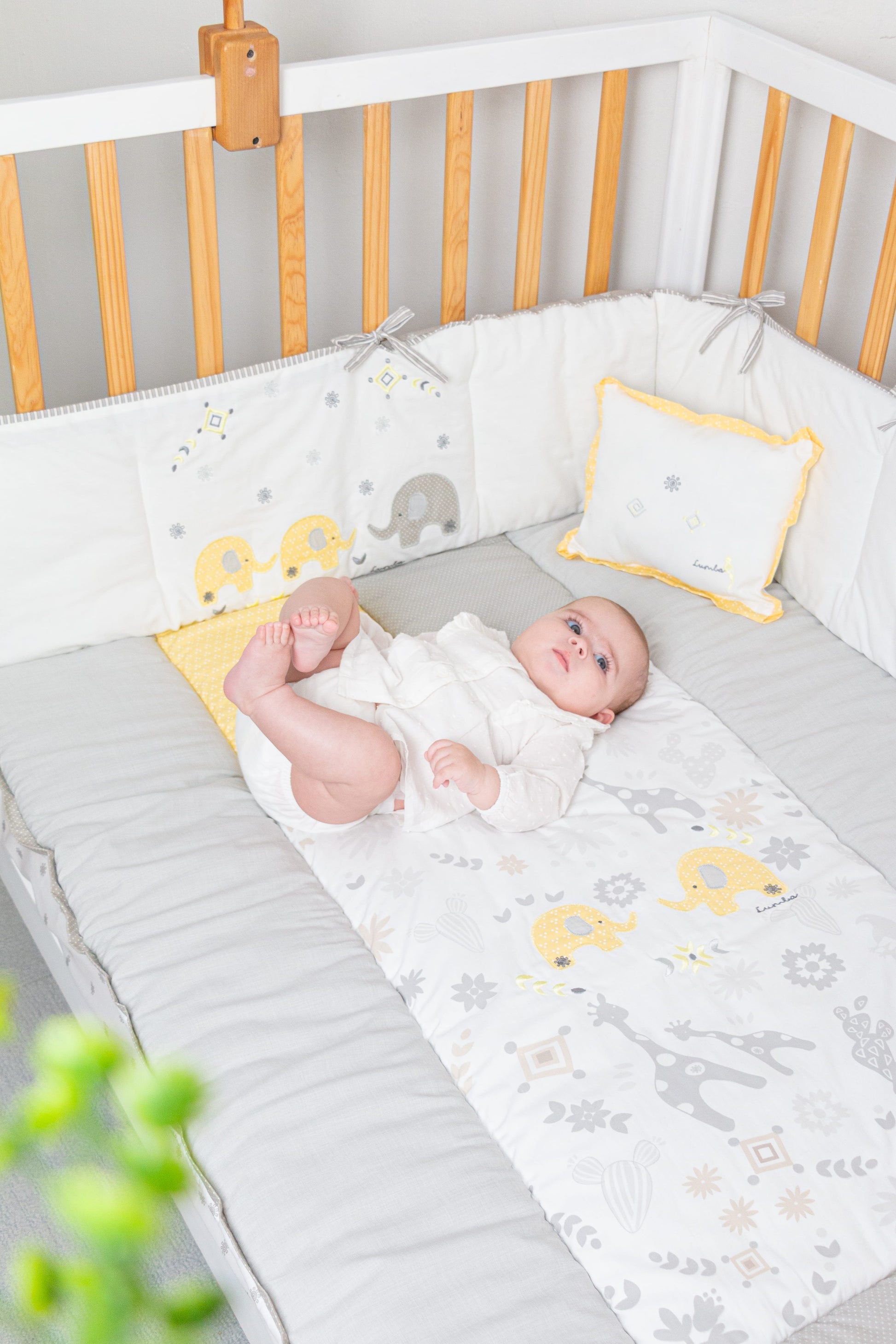 2. El protector más seguro (1 pza), evita que el bebé quede atrapado bajo el protector ya que cuenta con 17 lazos que se amarran firmemente a los barrotes arriba y abajo quedando muy seguro, cubre los 4 lados de la cuna. El frente del protector está bordado con el mismo diseño del edredón. Tiene 2 vistas al igual que el edredón.